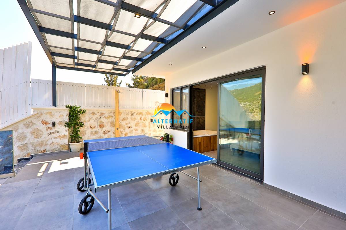 Şezlonglar, bahçe oturma grubu, salıncak, masa tenisi, yemek masası ve sandalyeleri bulunur.